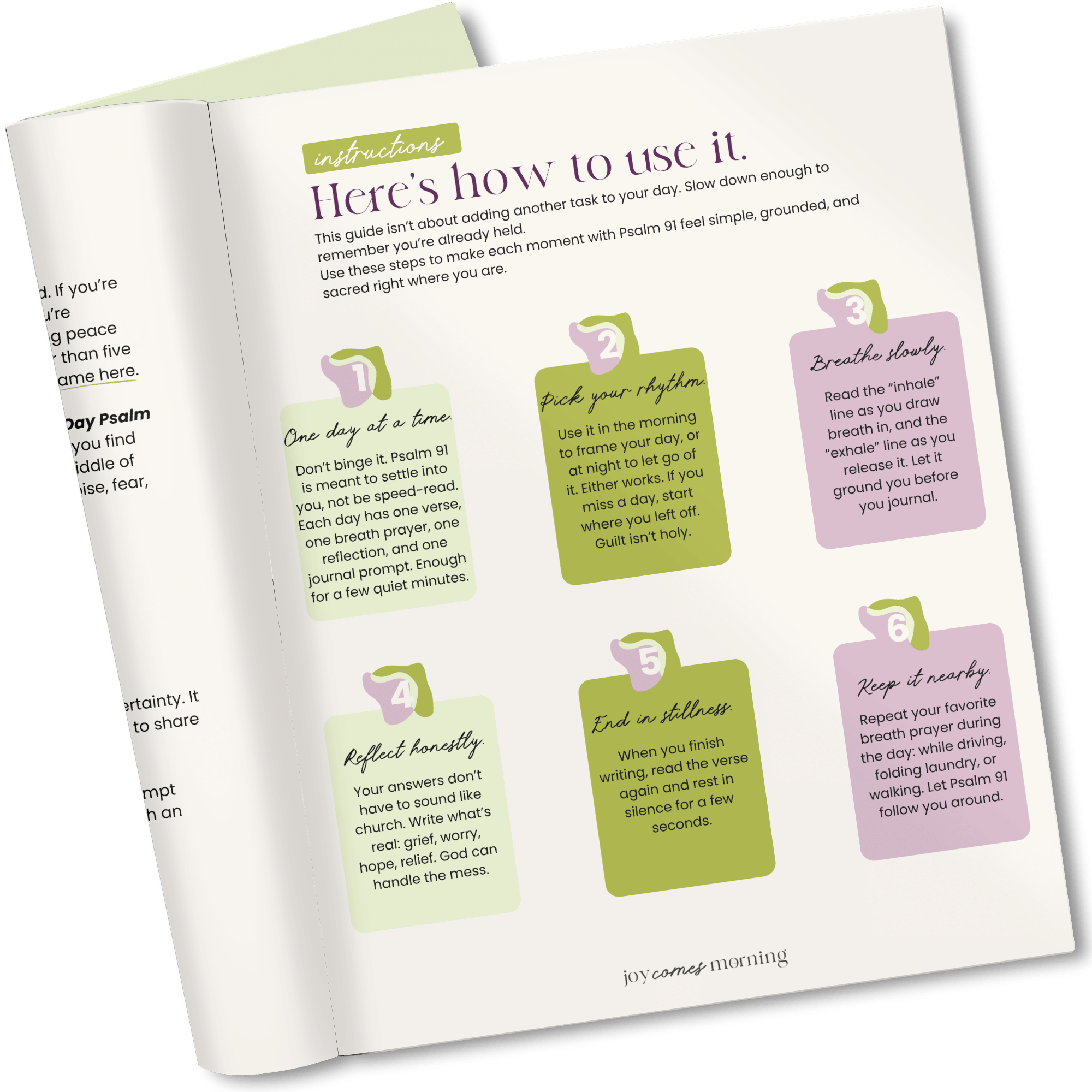 Download the 7-Day Psalm 91 Daily Devotional. A gentle, guided journey of breath prayers, reflection, and journaling to help you rest and find peace under God’s shadow.